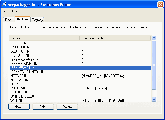 NewDisplays the INI File Exclusion Information dialog box from which you can specify additional .ini file exclusions.