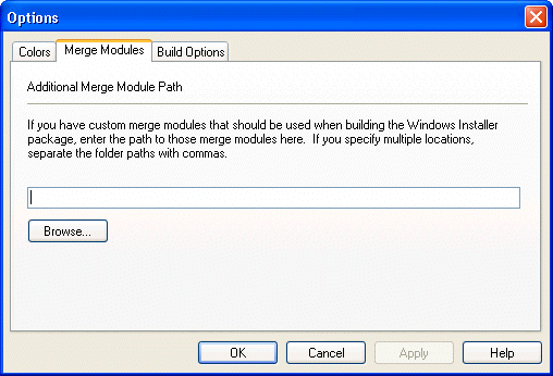 The Options dialog box, available from the Tools menu, presents options on three tabs: Colors , Merge Modules , and Build Options .