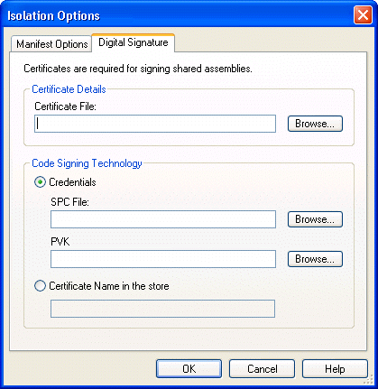 CredentialsSelect this option to use credential files as the code signing technology. If you select this option, you must supply the name and location of both your software publishing credential files: SPC File and PVK File. In order to receive a software publishing credentials and a private key, you must supply a certification authority, such as VeriSign, with specific information about your company and software.