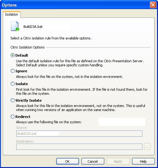| Default | Use the default isolation option for this file as defined on the Citrix XenApp. Select this option unless you require specific custom handling. |