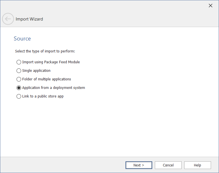 3. In the Source panel, select Packages from a deployment system / Application from deployment system and click Next . The Source Server Details panel opens.