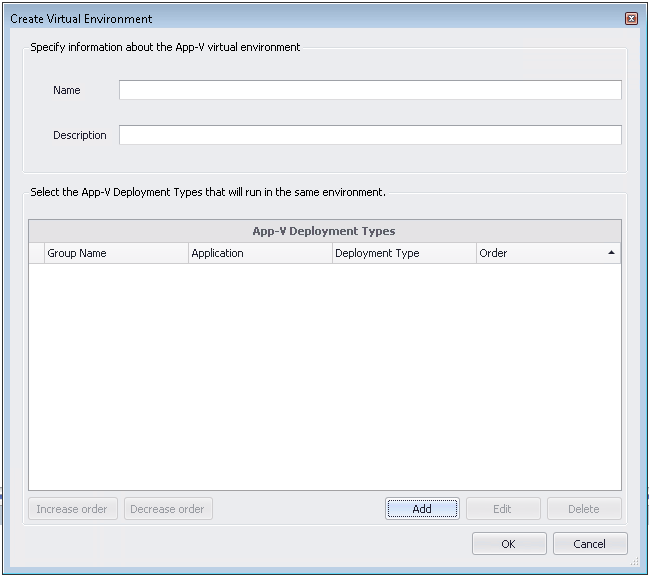 • If more than one group is listed on the Create Virtual Environment dialog box, you could use the Increase order and Decrease order buttons to reorder the list. When multiple virtual applications modify the same file system or registry values on a client computer, the application with the highest order will take precedence.