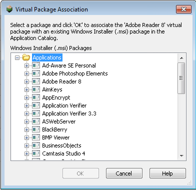 If you right-click on a virtual package in the Application Catalog tree and then select Associate Package from the shortcut menu, the Virtual Package Association dialog box opens, listing all of the Windows Installer packages in the Application Catalog. Select the virtual package’s source Windows Installer package and click OK . The Windows Installer package will now be listed in the Associations field on the Package Information tab of the Home Deployment Type View for the virtual package.