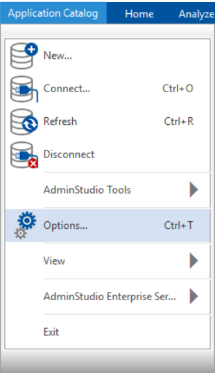 - In the Application Catalog tab, select Options . The Options dialog box opens.