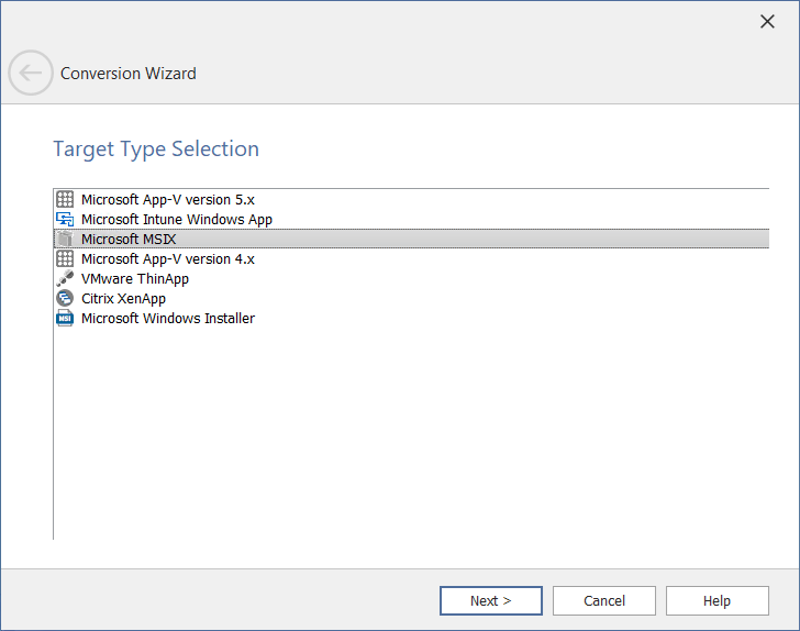 4. In the Target Type Selection panel, select Microsoft MSIX , and then click Next .