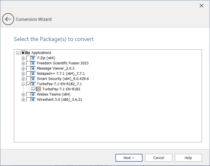 5. In the Select the Package(s) to convert panel, select the App-V packages or packages that you had selected when you invoked the Conversion Wizard are selected. Select additional packages, if desired, and click Next . The Package Output Location panel opens.
