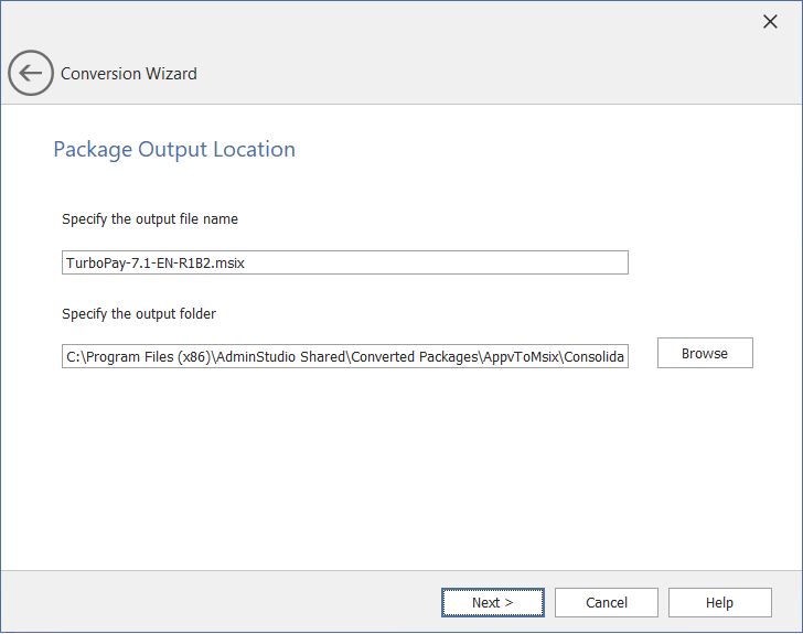 6. In the Package Output Location panel, By default, the source package name will be displayed in the Specify the output file name text box. If required, enter the desired name in the text box.