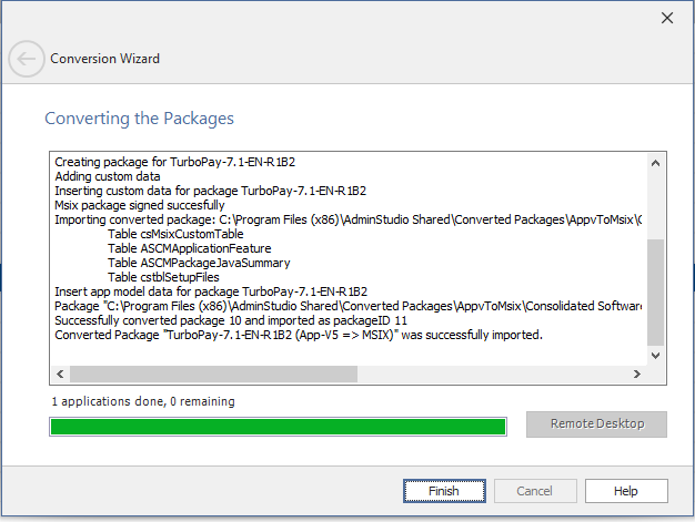9. In the Converting the Packages Panel, during conversion status messages are displayed. When conversion is complete, the results of the conversion are listed.