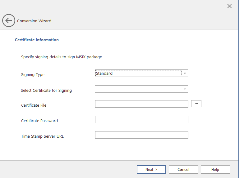 • Standard— Uses this option to digitally sign MSIX packages with a pre-configured certificate. Suitable for most common signing scenarios.
