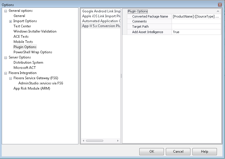 - In the middle pane, select App-V 5 Conversion Plugin . The App-V 5.0 conversion options are displayed in the right pane.