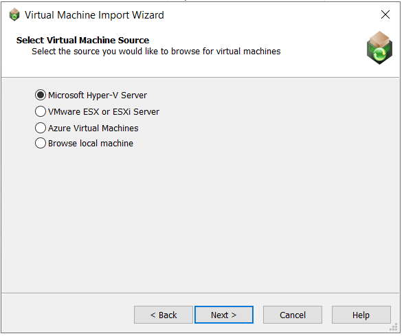 Microsoft Hyper-V ServerOn the Select Virtual Machine Source from Microsoft Hyper\-V Server panel, enter the following information: Server Name—Enter the server name of the Microsoft Hyper-V Server that you want to connect to. Authentication—Select Windows Authentication if you want to use the credentials of the logged in user to login to the Hyper-V Server. Select Server Authentication if you want to connect to the Hyper-V Server using the specified User name and Password .