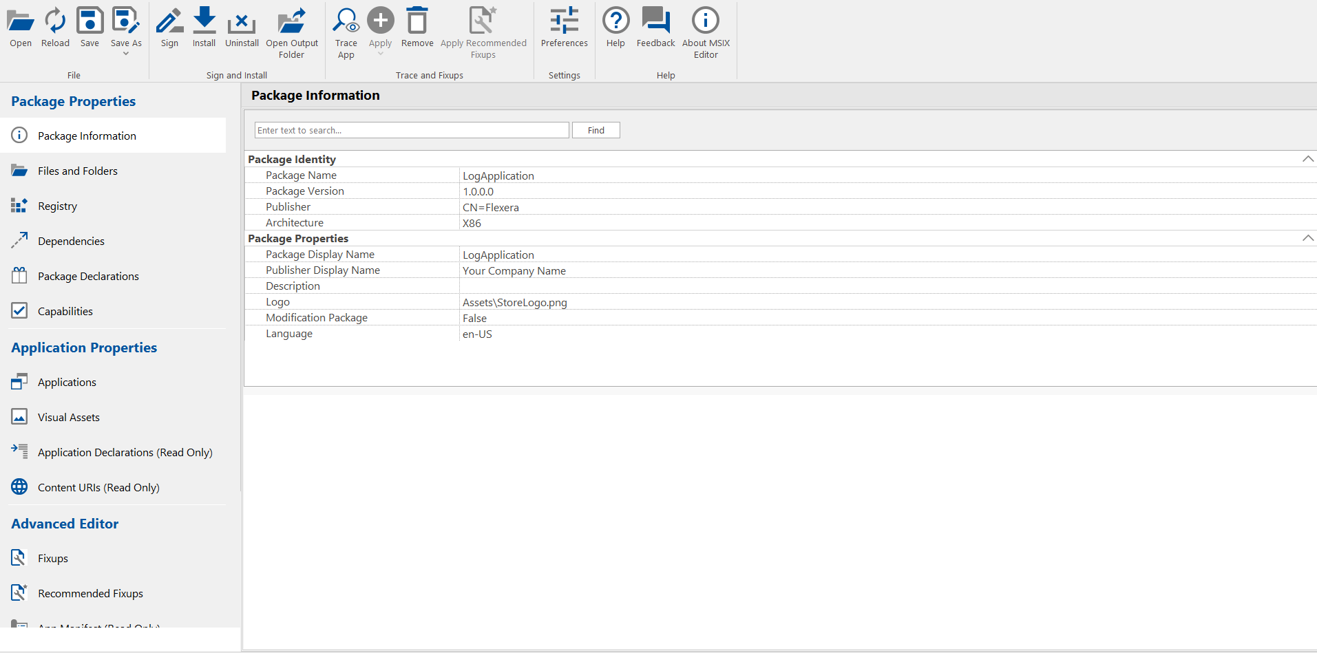 - Open the desired MSIX Package in the MSIX Editor. For more information, see Opening an MSIX Package.