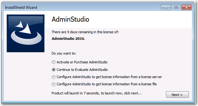 1. Launch AdminStudio ZENworks Edition. The following dialog box opens, prompting you to either activate or evaluate AdminStudio.