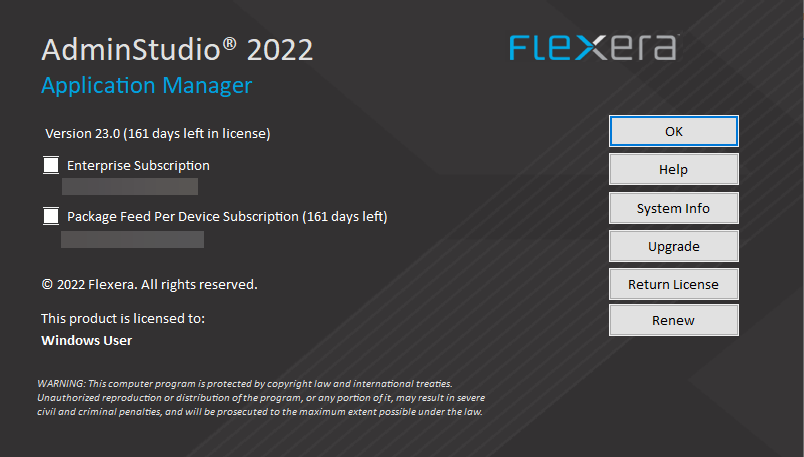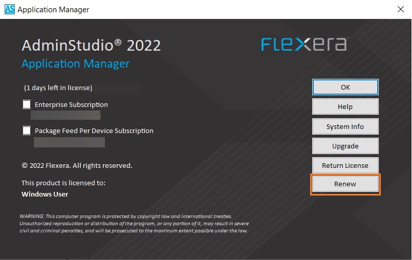 After the subscription is expired, upon its first launch, AdminStudio will automatically attempt to reactivate by checking of the subscription is renewed. The automatic reactivation will fail if the subscription is not renewed. When the subscription is renewed later, perform the following steps to reactivate AdminStudio with the new subscription end date.